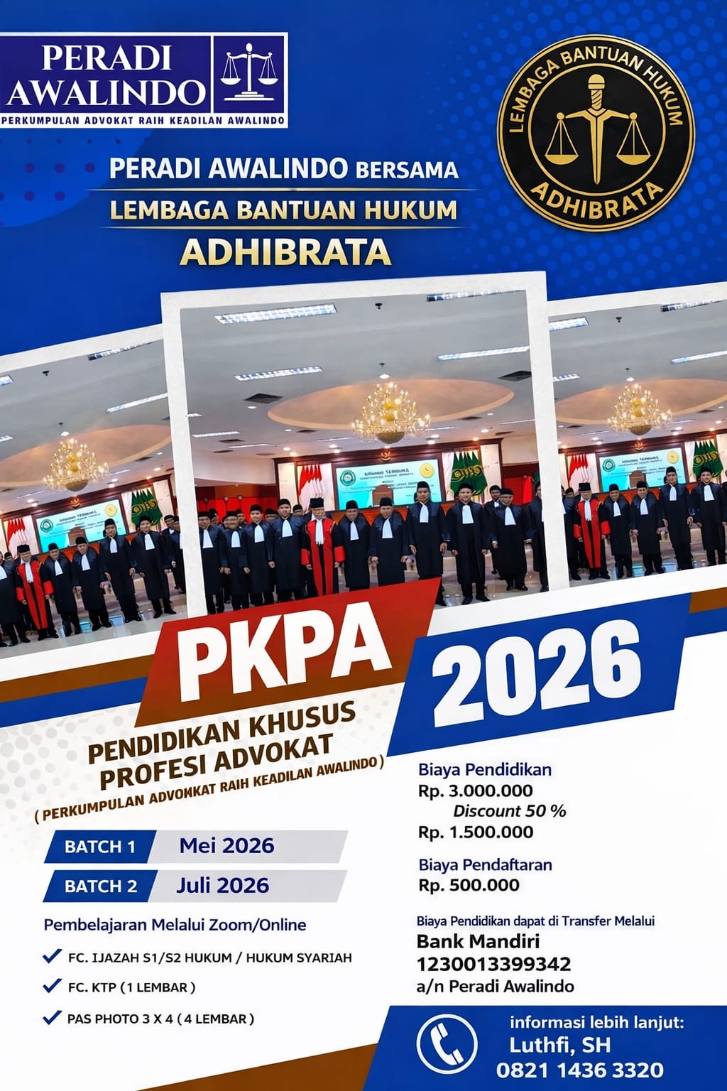 Perkumpulan Advokat Raih Keadilan Awalindo (Peradi Awalindo) menggelar Pendidikan Khusus Profesi Advokat (PKPA) angkatan pertama pada Sabtu, 25 April 2026, di Kantor DPP Peradi Awalindo, Jalan Tanah Abang III No. 31, Petojo Selatan, Gambir, Jakarta Pusat. Kegiatan ini dilaksanakan secara virtual dan diikuti oleh 22 peserta dari berbagai latar belakang hukum.